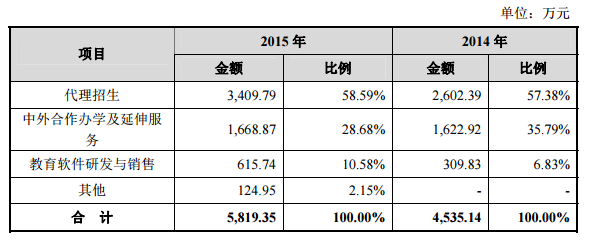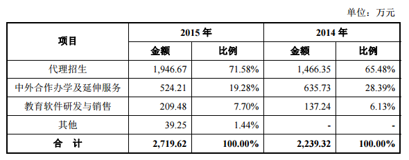 表中,2015年,代理招生為1946.67萬元,占比71.58%;中外合作辦學及延伸服務為524.21萬元,占比19.28%;教育軟件研發(fā)與銷售209.48萬元,占比7.70%。