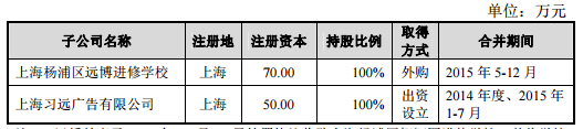 據(jù)悉,遠播教育于 2014 年 10 月 27 日簽署協(xié)議收購上海楊浦區(qū)智匯園進修學校,并將學校 更名為上海楊浦區(qū)遠博進修學校。上海習遠廣告有限公司成立于 2009 年 9 月 25 日,由遠播教育 100%控股。2015 年 7 月 20 日,全資子公司上海習遠廣告有限公司完成工商注銷,因此不再將其納入合并財務報 表范圍。