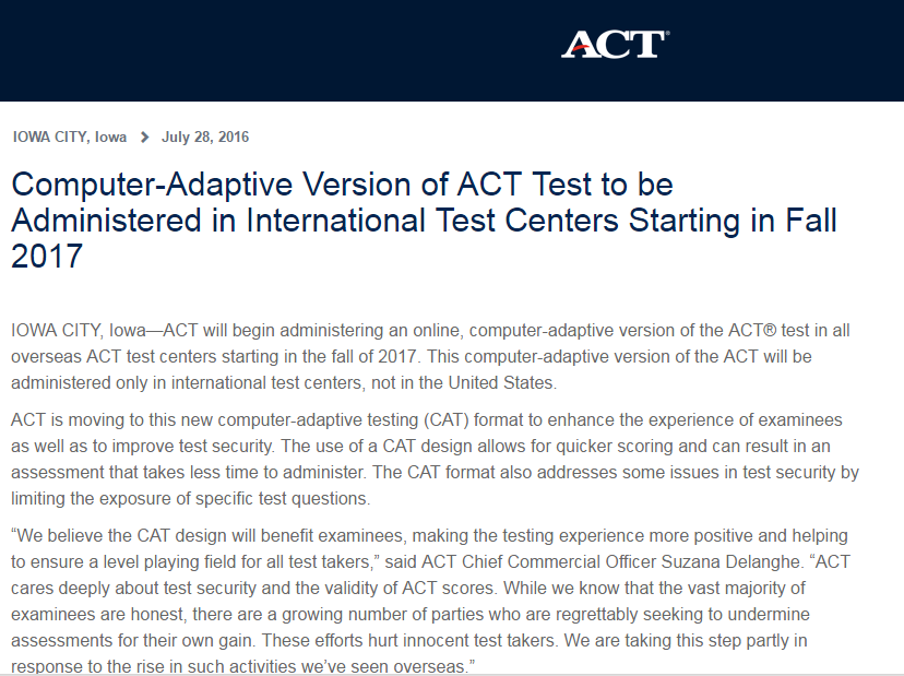 多知網(wǎng)7月29日消息,昨日,IOWA CITY,Iowa在官網(wǎng)上發(fā)布報(bào)道稱:全球ACT考試中心將于2017年秋季開始啟用在線機(jī)考版本測(cè)試。此機(jī)考版本ACT測(cè)試將只在國際考試中心實(shí)施,并不包括美國本土。