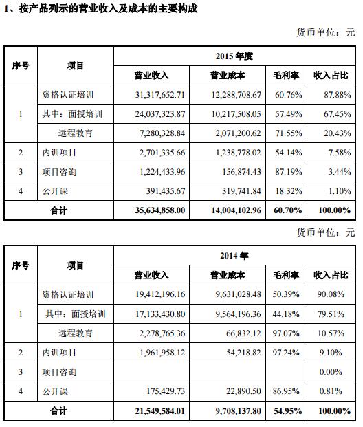 2015年度、2014年度主營(yíng)業(yè)務(wù)收入占營(yíng)業(yè)收入比例均為100%。主營(yíng)業(yè)務(wù)收入主要來(lái)源于以PMP、軟考為主的資格認(rèn)證培訓(xùn)服務(wù)。