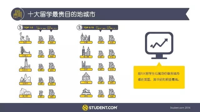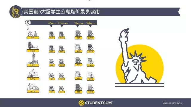 在美國,紐約市是最貴留學目的地城市,公寓平均周租金為526美元(月均價2293美元),比第二貴城市舊金山高出14%。其它頗受歡迎且留學生住宿費用高的西海岸城市包括伯克利(月均價2003美元)和拉荷亞(月均價1893美元)。