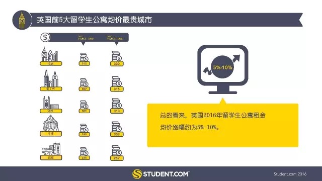 這部《2016年留學生公寓報告》公布的數(shù)據(jù)表明,全球留學生公寓均價最貴的城市是紐約市,周租金均價為526美元(月均價2293美元);倫敦在英國最貴留學目的地城市名單上位居榜首,周租金均價為330美元;悉尼在澳大利亞主要城市中均價最貴,留學生公寓平均周租金為268美元。