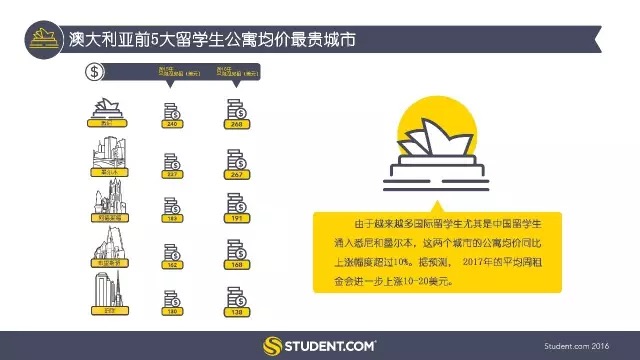 在赤道以南的澳大利亞,悉尼的留學生公寓均價最貴,平均周租金為268美元。由于國際留學生尤其是中國留學生越來越多涌入悉尼和墨爾本,這兩個城市的公寓價格同比漲幅超過10%。據(jù)預測,2017年的周租金均價會進一步上漲10-20美元。