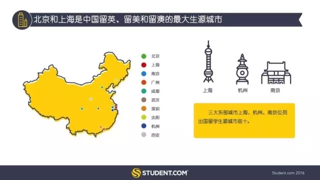Student.com的數(shù)據(jù)表明,2016年,北京和上海是中國留英、留美和留澳學生最大生源城市。中國東部的杭州和南京等城市也名列前十。