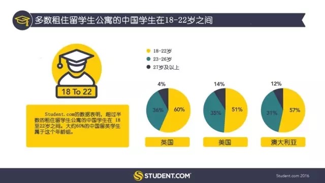 根據(jù)Student.com的報告,超過半數(shù)的租住留學生公寓的中國留英、留美和留澳學生在18至22歲之間。大約60%的中國留英學生屬于這個年齡組。