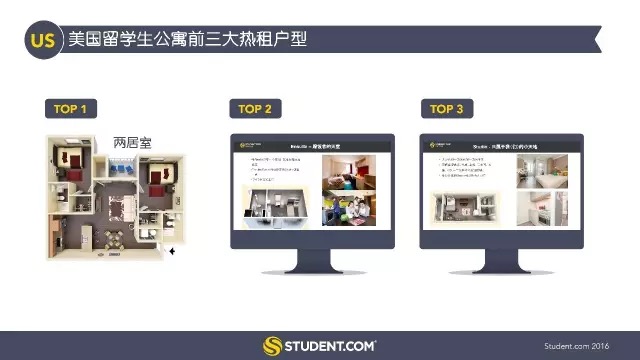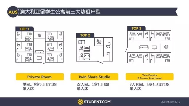 留學生公寓的熱租戶型中,留美的18-26歲中國學生首選是兩臥兩衛(wèi)公寓,原因是他們喜歡和同學合住。相比中國留澳學生偏愛帶有一張單人床的單間。