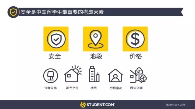 Student.com報告表明,安全、地段和價格是中國學生選擇住處時最看重的方面。此外,學生們選擇公寓時還關注房間是否朝南(陽光充足)、住處的樓層以及合租室友。