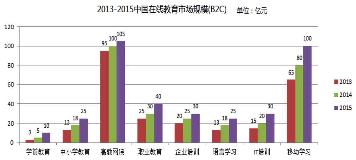 調(diào)研結(jié)果表示,2013年和2014年高校網(wǎng)教、移動(dòng)學(xué)習(xí)市場(chǎng)規(guī)模較大,高校網(wǎng)院超過(guò)了100億,移動(dòng)學(xué)習(xí)2015年也達(dá)到了100億。