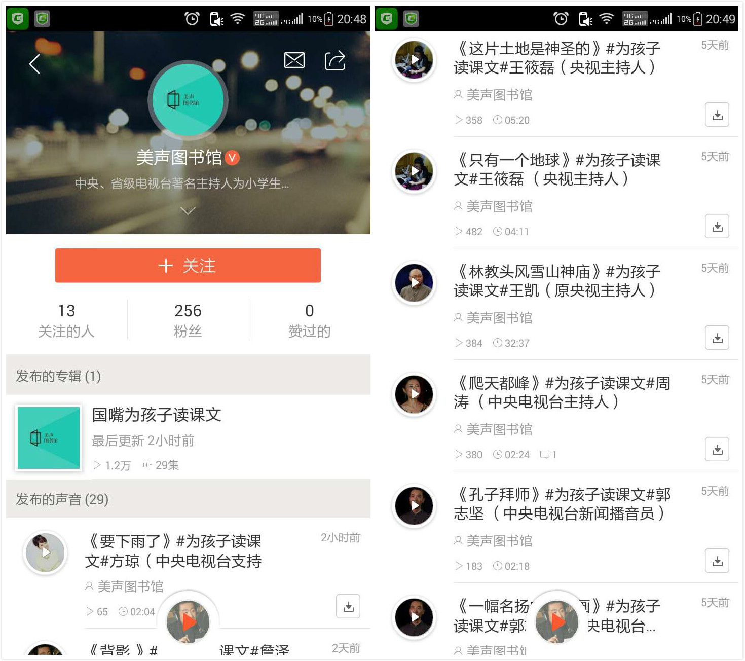 進入喜馬拉雅FM“美聲圖書館”界面,首頁顯示5天之內(nèi)已發(fā)布29段音頻,專輯“國嘴為孩子讀課文”播放量達1.2萬次。