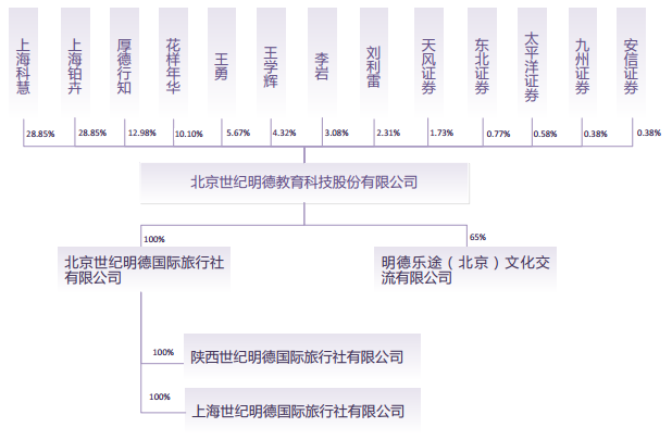世紀明德旗下先后設(shè)立3家子公司。公司于2007年6月設(shè)立國際旅行社,主要負責(zé)公司國內(nèi)外游學(xué)活動中的接待業(yè)務(wù),包括交通、住宿、餐飲、景點門票、保險、安全等方面;2015年5月設(shè)立青青部落,主要產(chǎn)品是定點的主題營的體驗式活動,通過心理學(xué)、軍事、科技、體育等方面的體驗式活動鍛煉參與者的生理、心理、智力和社交能力等;2016年2月設(shè)立明德樂途,主要承接公司及其他客戶的夏令營配套物資制作、攝影擴印活動等。