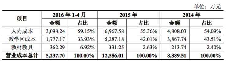 營(yíng)業(yè)成本方面,高思教育營(yíng)業(yè)成本構(gòu)成主要包括教師課酬、人員工資、獎(jiǎng)金等人力成本,房屋租賃費(fèi)及裝修費(fèi)用等教學(xué)區(qū)成本以及購買教材教具的費(fèi)用。具體成本構(gòu)成如下: