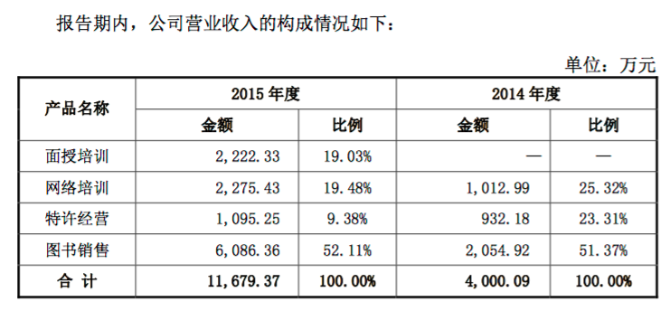 (圖為文都教育公開轉(zhuǎn)讓說明書中的營業(yè)收入構(gòu)成)