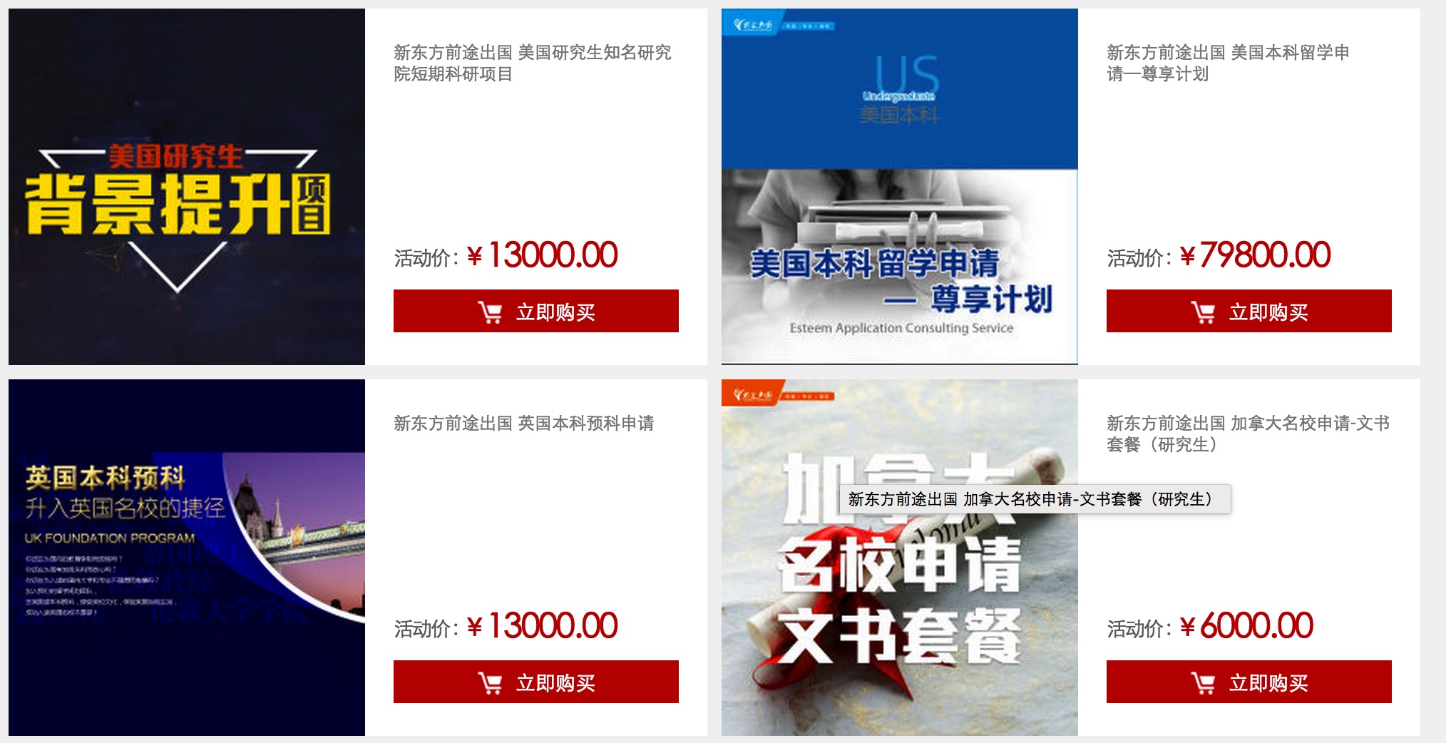筆者發(fā)現(xiàn),新東方前途出國在京東上線了多條線的產(chǎn)品,包括美國線、英國線、澳新線、加拿大線、歐亞線等,價位在6000-138000元不等。目前,京東留學(xué)頻道上沒有發(fā)現(xiàn)新東方前途出國用戶的評價。