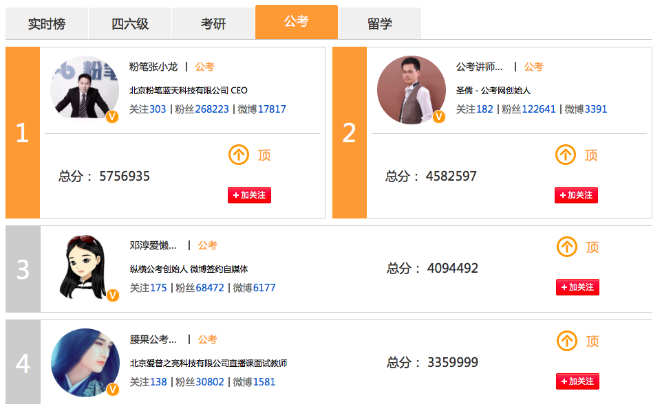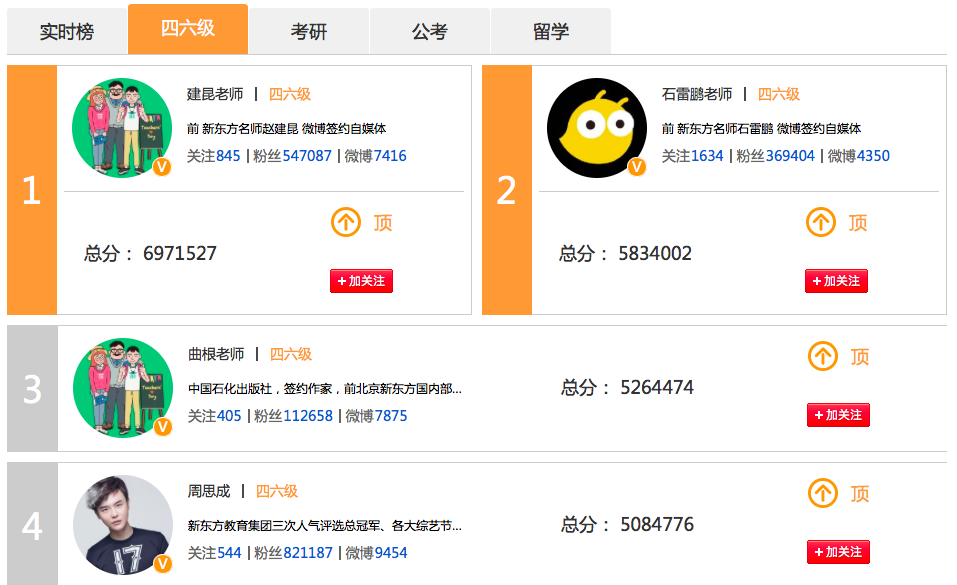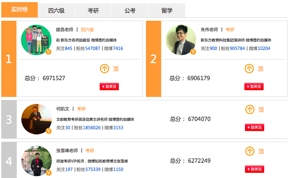 此榜單一期針對(duì)大學(xué)生推出涵蓋:四六級(jí)、考研、公務(wù)員考試、留學(xué)培訓(xùn)四個(gè)細(xì)分領(lǐng)域;實(shí)時(shí)反饋老師們的微博活躍程度,以微博閱讀量、秒拍短視頻播放量、一直播播放量,為基礎(chǔ)數(shù)據(jù),輔助以粉絲投票形成榜序。