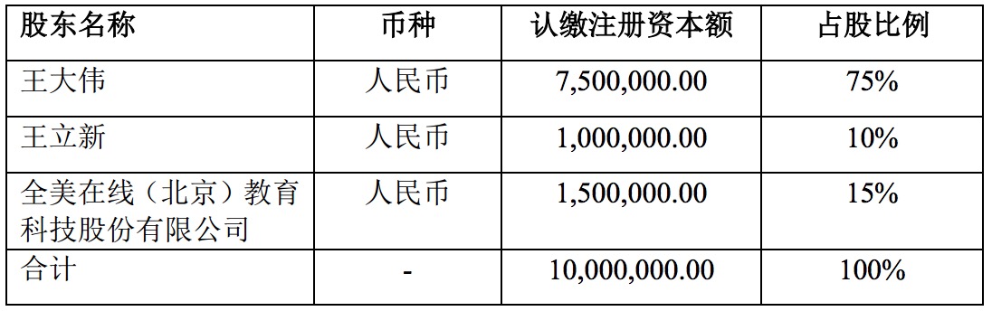 投資完成后,王大偉、王立新、全美在線認(rèn)繳注冊資本額分別為:750萬元、100萬元、150萬元,占股比例分別為75%、10%、15%。