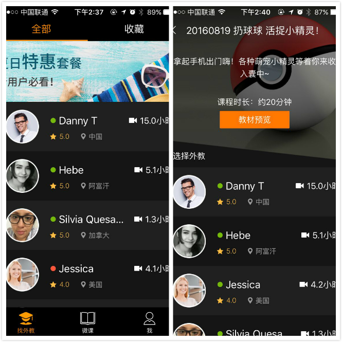筆者打開(kāi)APP頁(yè)面發(fā)現(xiàn),Vipa包括“找外教”、“微課”及“我”三個(gè)板塊。與其它幾款語(yǔ)伴軟件類似,在Vipa的主界面上可以看到教師的定位地區(qū)、星級(jí)、在線狀態(tài)及上課時(shí)間。其中,外教主要來(lái)自美國(guó)、英國(guó)、阿富汗等國(guó)家;外教星級(jí)評(píng)定3-5級(jí)不等;在線狀態(tài)分為在線、忙碌、離開(kāi);視頻總時(shí)間最高達(dá)到15小時(shí)。據(jù)了解,目前Vipa處于上線初期,APP頁(yè)面上外教人數(shù)約35人。