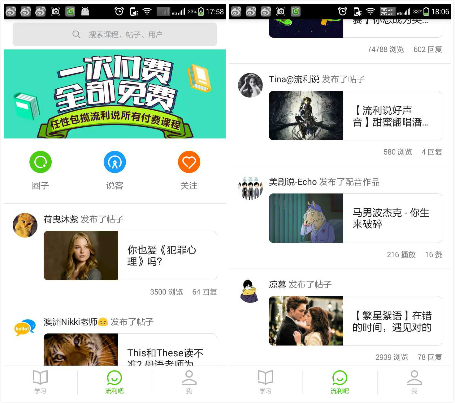 同時,該版本整合了流利說“發(fā)現(xiàn)”和“流利吧”兩個Tab,以Feeds流作為展現(xiàn)形式,建立了以人和內(nèi)容為主的社交體系。產(chǎn)品內(nèi)容包括課程、短視頻、主播電臺和用戶作品等,并支持用戶間的相互關(guān)注和私信互動。