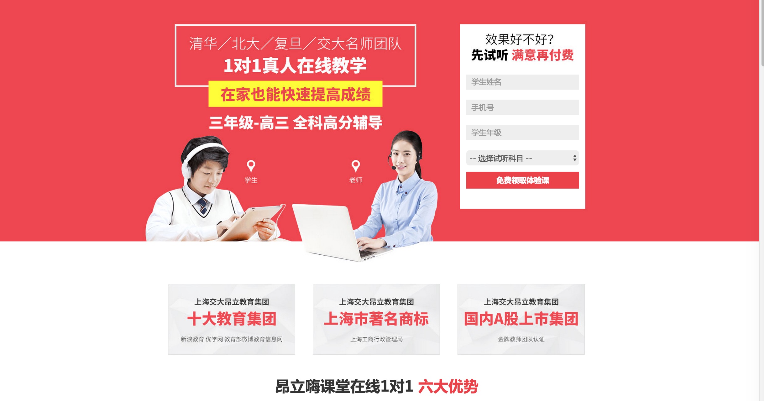 官網(wǎng)顯示,昂立嗨課堂開設(shè)中小學(xué)全科真人在線一對一輔導(dǎo),教師主要來自清華、北大、復(fù)旦、交大等,課程包括三年級-高三階段的全科輔導(dǎo)。