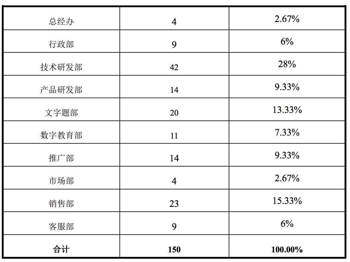 英騰教育控股股東蘭濤直接持有48.57%的股權(quán),為英騰教育第一大股東;蘭濤與童喜林為合法夫妻,兩人為一致行動(dòng)人,童喜林持有公司 32.21%的股權(quán);蘭濤是柳州英騰投資中心(有限合伙)的普通合伙人,且此合伙企業(yè)持有公司 12.38%的股權(quán)。綜上,公司實(shí)際控制人蘭濤和童喜林可以控制公司股東大會(huì) 93.16%的表決權(quán)。截至報(bào)告期末,公司員工人數(shù)總計(jì) 150 人。