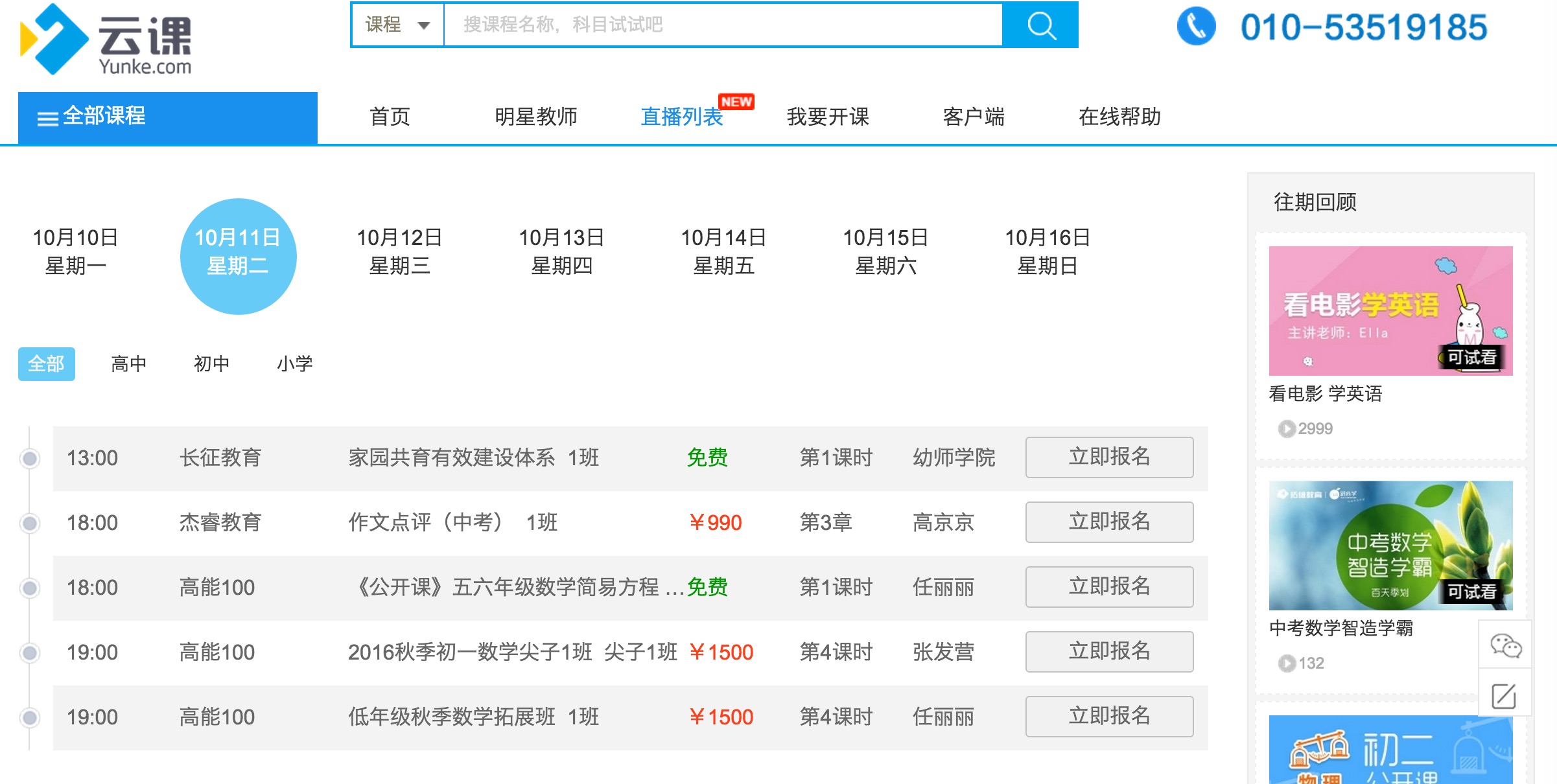 筆者注意到“直播列表”注明了特殊標(biāo)志,點(diǎn)擊發(fā)現(xiàn)頁(yè)面顯示的是各階段課程安排表,包括直播課程時(shí)間、課時(shí)、費(fèi)用、教師信息及報(bào)名通道等,課程費(fèi)用0-1500元/課時(shí)不等。此外,首頁(yè)上還提供了“我要開(kāi)課”的欄目,提供給老師或機(jī)構(gòu)選擇。