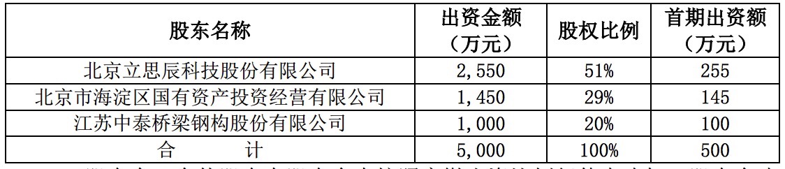 根據(jù)公告顯示,首期出資比例為10%,立思辰首期出資人民幣255萬元,海國投首期出資人民幣145萬元;中泰橋梁首期出資人民幣100萬元。