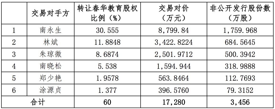 2016年11月14日,公司與春華教育股東南永生、林斌、朱瓊微、南曉松、鄭少艷和涂源貞 6 名自然人(以下簡(jiǎn)稱“交易對(duì)手方”)共同簽署了附條件生效的《發(fā)行股份購(gòu)買資產(chǎn)協(xié)議》。
