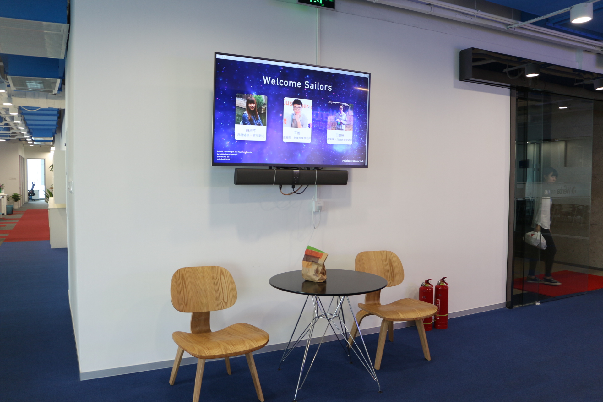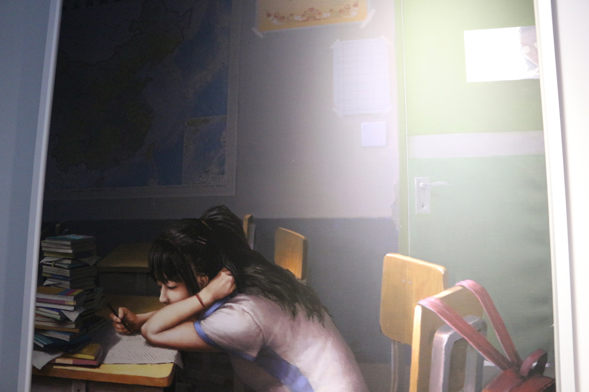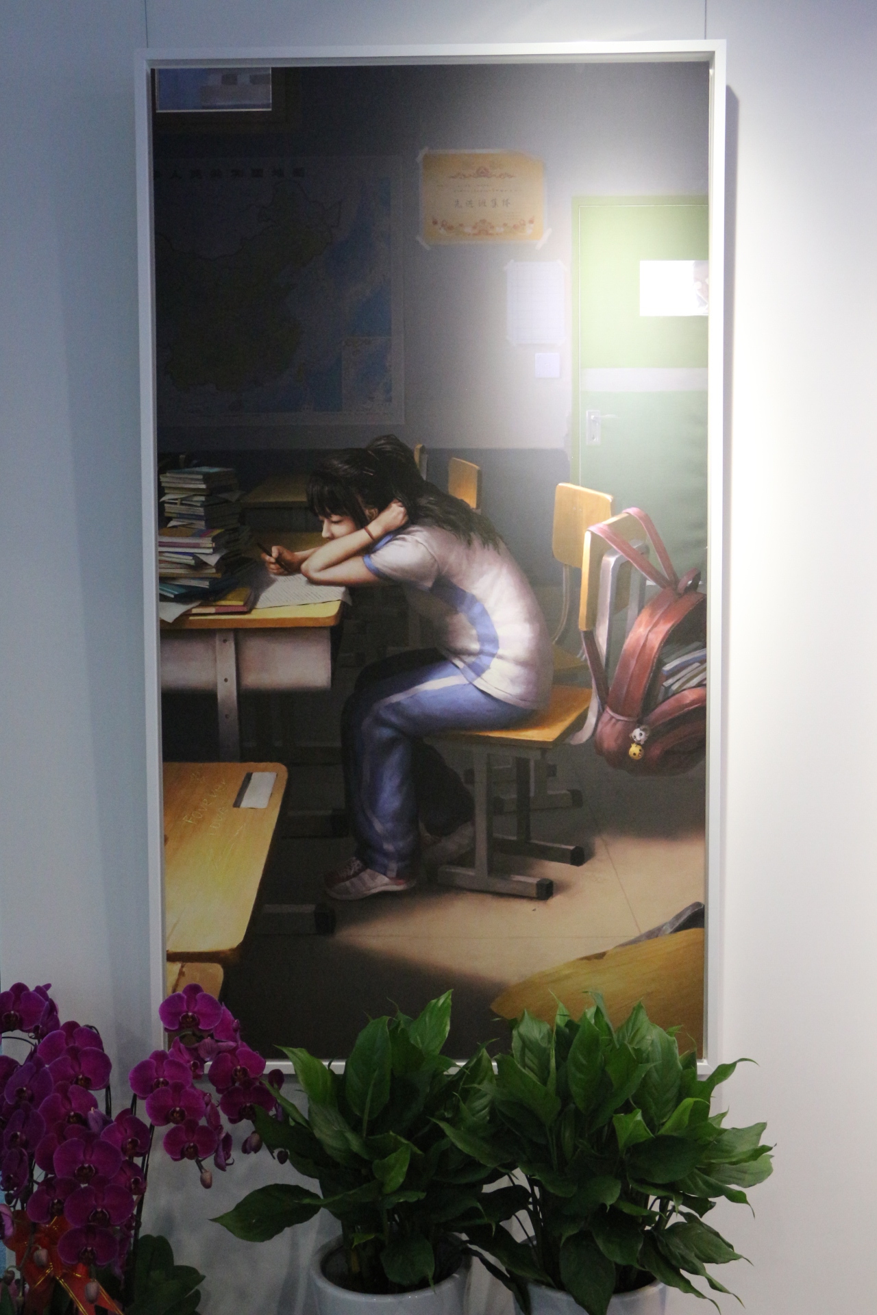前臺(tái)兩側(cè)的畫都出自公司UI負(fù)責(zé)人之手。一幅表現(xiàn)的是學(xué)生在教室埋頭做作業(yè)的情景,亮點(diǎn)請(qǐng)自尋。
