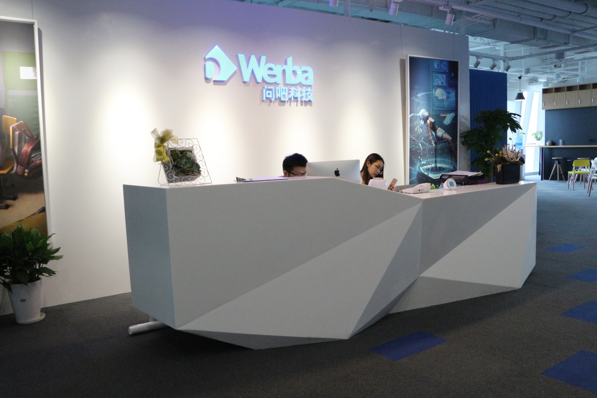 移步至7樓,前臺(tái)背景墻上印有學(xué)霸君公司的LOGO。整體環(huán)境以藍(lán)白為主,“我們給它起名叫做‘學(xué)霸藍(lán)’”,工作人員介紹道。