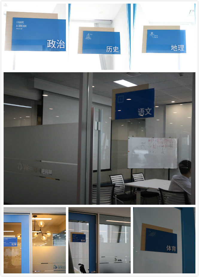 學(xué)霸君每個(gè)會(huì)議室的門牌以學(xué)科命名,“政治”、“歷史”、“地理”、“化學(xué)”、“美術(shù)”、“體育”……還有大會(huì)議室“語文”。門牌上的小圖標(biāo)也和科目相關(guān),滿滿的都是學(xué)生時(shí)代的回憶。