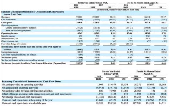 招股書披露,四季教育2016財年(截至2016年2月29日)營收9380萬元,2017財年(截至2017年2月29日)營收2.03億元,同比增長116.4%;2016財年歸屬四季教育(開曼)的凈虧損為3097.6萬元,2017財年凈利潤為1766.6萬元;2016財年經(jīng)營活動產(chǎn)生的現(xiàn)金凈額100.9萬元,2017財年為1.19億元。