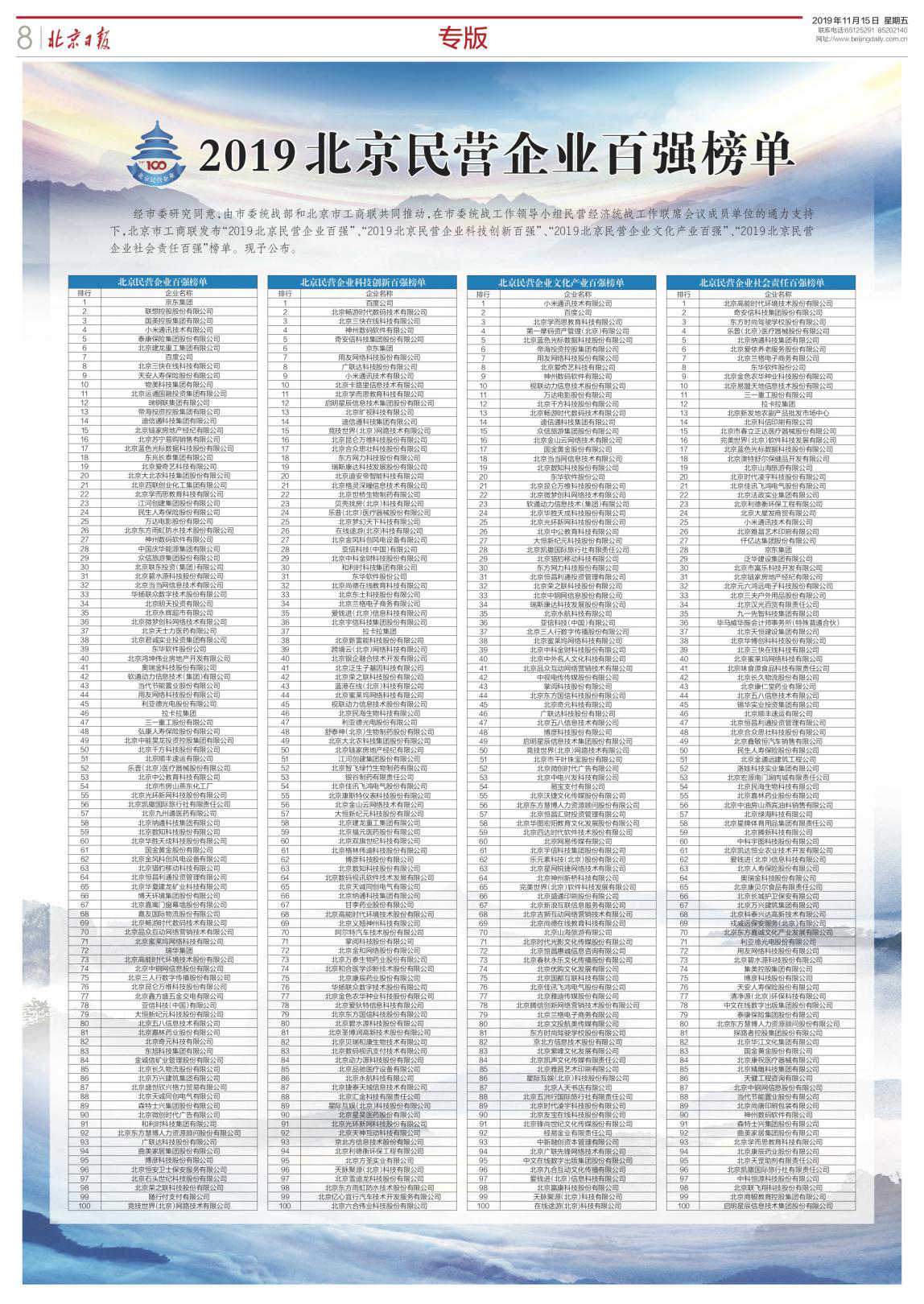 北京市工商聯(lián)正式發(fā)布發(fā)布“2019北京民營企業(yè)百強”本次榜單經(jīng)中共北京市委研究同意,由北京市委統(tǒng)戰(zhàn)部和北京市工商聯(lián)共同推動,北京市23個有關(guān)委辦局通力支持,旨在促進(jìn)民營企業(yè)更好地適應(yīng)首都產(chǎn)業(yè)發(fā)展政策,推動實現(xiàn)更高質(zhì)量的發(fā)展。