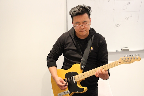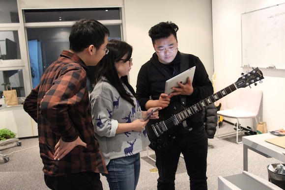 10點(diǎn)半,公司里的人已經(jīng)走得差不多了,黎小說拿出放在辦公室的吉他,接上音箱,又拿出手機(jī),接上另一個(gè)音箱,伴著手機(jī)里面的鼓點(diǎn),黎小說開始了吉他的彈奏,這是黎小說一天中為數(shù)不多的閑暇時(shí)光。“今年的目標(biāo),是把攝影集發(fā)了,然后把自己的寫的三首歌再錄一遍。”黎小說說。