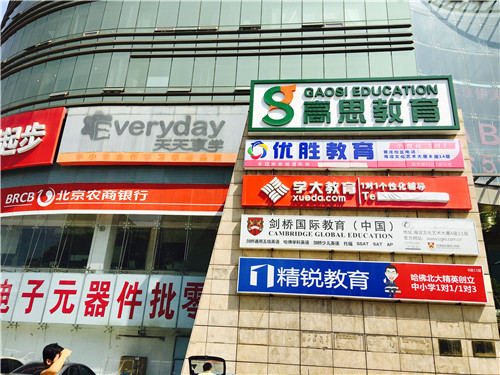 一面墻被五家教育機(jī)構(gòu)“刷屏”,附近寫字樓的宣傳海報也全和教育有關(guān):在這里,似乎教育之外的宣傳廣告,都變得有些“非主流”。