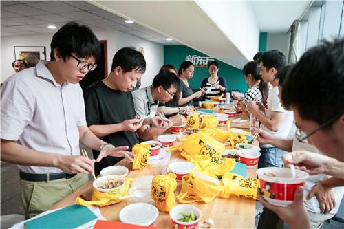 在新東方總部,剛剛開完會的一個團(tuán)隊直接在小天臺吃起了外賣。