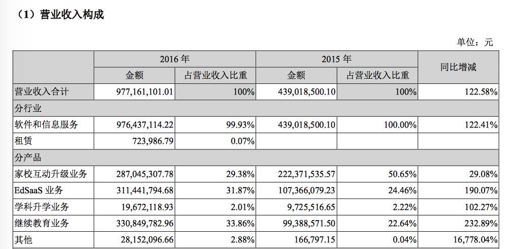 從2015年、2016年財(cái)報(bào)數(shù)據(jù)看,在全通教育四大業(yè)務(wù)群中,以家校通業(yè)務(wù)轉(zhuǎn)變而來(lái)的家?;?dòng)升級(jí)業(yè)務(wù)營(yíng)收占比分別為50.65%、29.38%。而學(xué)科升學(xué)業(yè)務(wù),占比僅為2.22%、2.01%。