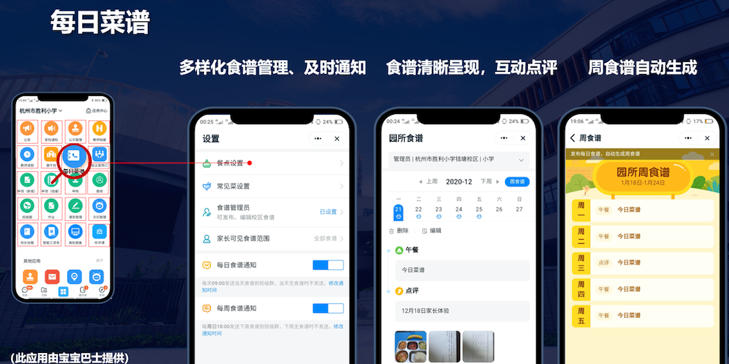 以學(xué)生就餐場景為例,家長以前不清楚孩子每天在學(xué)校吃得怎么樣,現(xiàn)在通過“勝利釘”上的“每日菜譜”應(yīng)用呈現(xiàn)展示,家長不光可以看到飯菜,還可以點評。如果發(fā)現(xiàn)有需要提升的地方,可以生成反饋流程直接發(fā)給相關(guān)負(fù)責(zé)人,快速得到響應(yīng)和優(yōu)化,整個過程通過數(shù)字化的方式透明公開。
