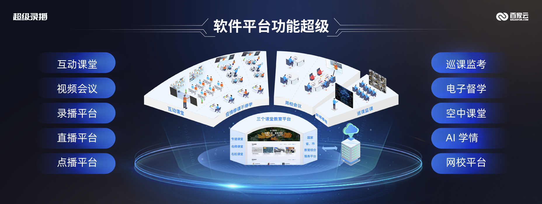 百家云稱,目前,超級(jí)錄播已經(jīng)覆蓋互動(dòng)課堂、視頻會(huì)議、錄播課堂、直點(diǎn)播平臺(tái)(具備百萬(wàn)并發(fā)的直播能力)、互動(dòng)課堂、巡課監(jiān)考、電子督學(xué)、空中課堂、AI學(xué)情、網(wǎng)校平臺(tái)等十余個(gè)教育場(chǎng)景。