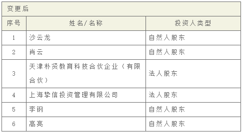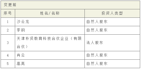 工商信息顯示,樸新教育成立于2014年9月28日,注冊(cè)資本3961萬(wàn)元,法定代表人沙云龍,投資人包括天津樸賢教育科技合伙企業(yè)(有限合伙)、上海摯信投資管理有限公司。