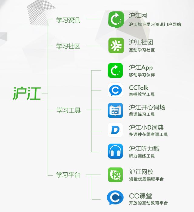 此次品牌升級之后,“滬江”將成為母品牌,旗下包含四大業(yè)務體系:滬江網,為用戶提供學習資訊; 滬江社團,用戶的學習社區(qū);多樣的學習工具如CCTalk、開心詞場、小D詞典、聽力酷等;兩個學習平臺:錄播平臺“滬江網校”和直播平臺“CC課堂”。