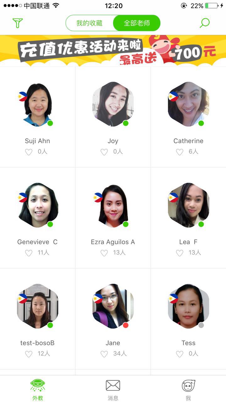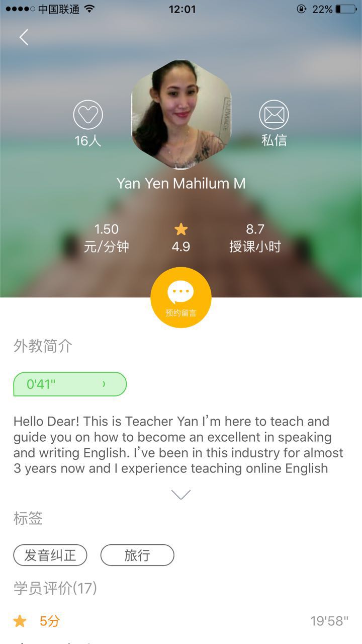 教師個(gè)人界面有語音及文字的個(gè)人介紹,教師標(biāo)簽及學(xué)員評價(jià)。目前大部分教師為菲律賓國籍,費(fèi)用在1.5-3元每分鐘。