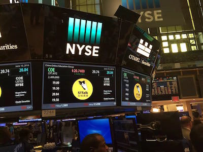 多知網(wǎng)6月11日消息,昨晚,51Talk在美國(guó)紐交所敲響上市鐘聲。51Talk開盤價(jià)為19.50美元,相比發(fā)行價(jià)漲2.6%;盤中該股最高上觸20.84美元,最低下探至18.84美元;最終收?qǐng)?bào)18.98美元,相比發(fā)行價(jià)19美元下跌0.02美元,跌幅0.1%。