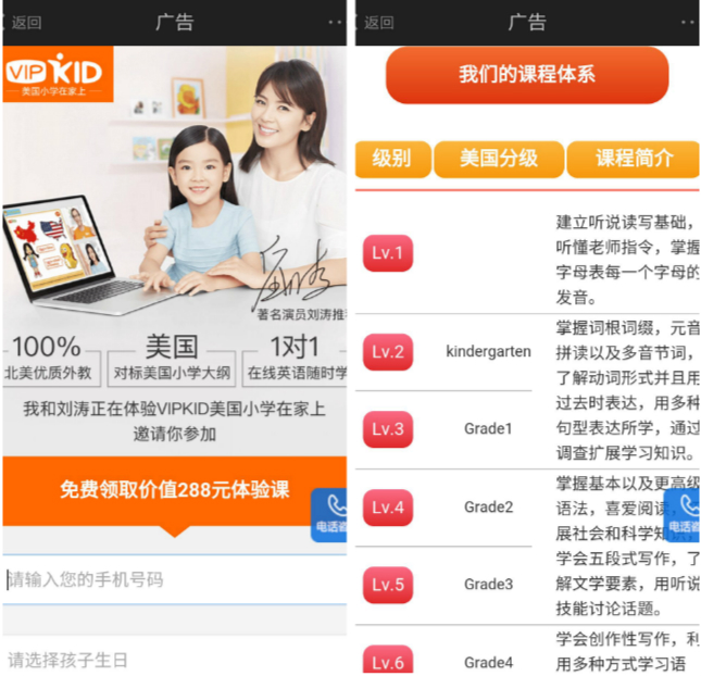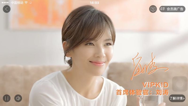 據(jù)悉,點(diǎn)播《小別離》進(jìn)入廣告頁(yè)面,劉濤作為首席體驗(yàn)師為VIPKID代言,VIPKID的廣告主題“美國(guó)小學(xué)在家上”,廣告時(shí)間15秒。