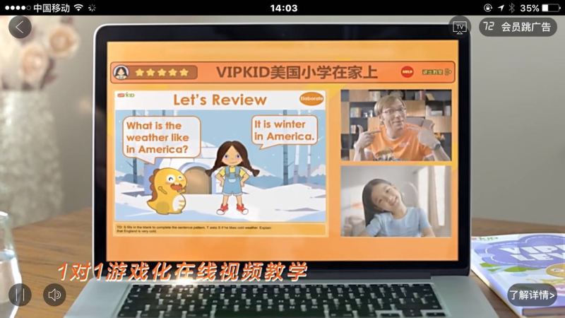 廣告頁(yè)面中播放小標(biāo)題“1對(duì)1游戲化在線(xiàn)視頻教育“、”對(duì)標(biāo)美國(guó)小學(xué)教程“、”純正北美少兒經(jīng)驗(yàn)外教“等,以及劉濤的廣告詞:“我挑剔,所以我選擇VIPKID。”