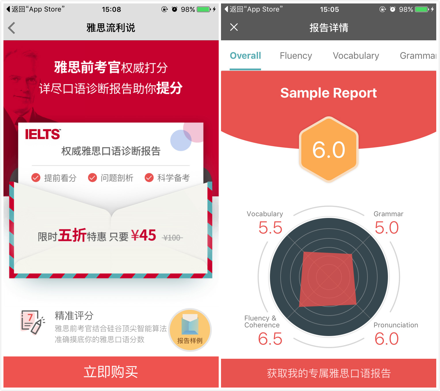該口語(yǔ)診斷報(bào)告原價(jià)100元,近期限時(shí)特惠,售價(jià)45元。(多知網(wǎng) 徐佐君)
