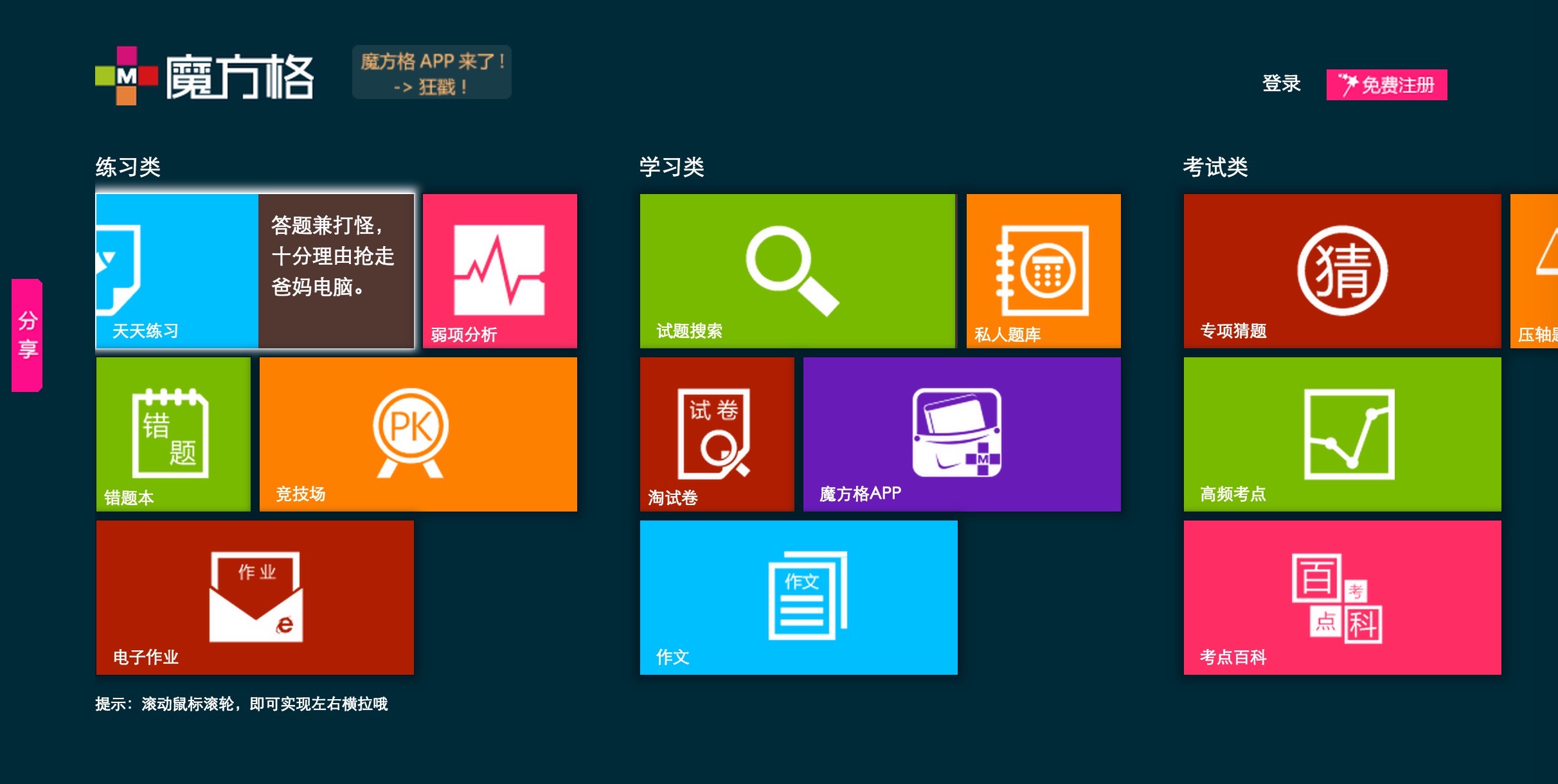 魔方格上線于2013年9月,2014年10月獲得復(fù)星昆仲近千萬(wàn)美金投資。從2015年開(kāi)始,魔方格在原先to C的K12題庫(kù)供應(yīng)的基礎(chǔ)上,開(kāi)展to B業(yè)務(wù),為K12線下培訓(xùn)機(jī)構(gòu)提供定制化智能測(cè)評(píng)系統(tǒng)、智能教學(xué)系統(tǒng)和智能練習(xí)系統(tǒng)。