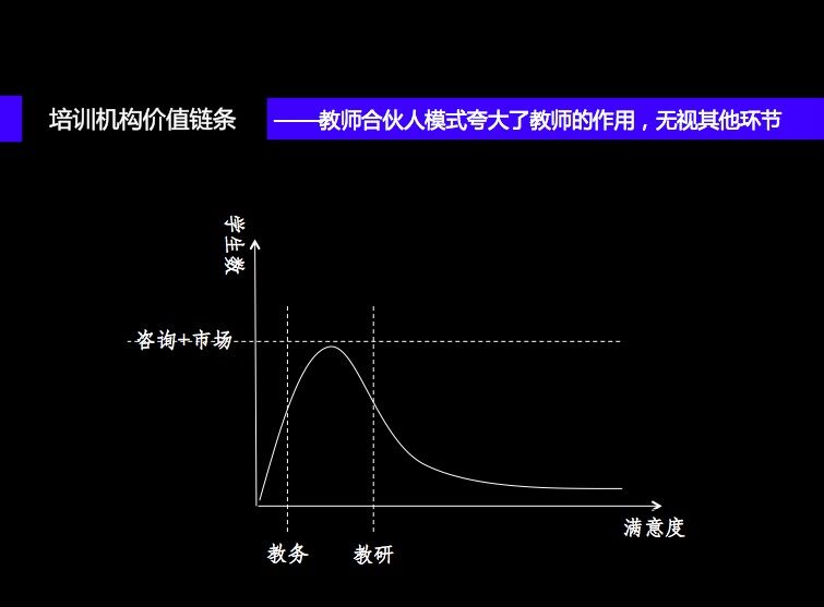 教研和教學(xué)的努力,這部分也是名師的價值是讓特別有效果的學(xué)生比例有所提高,教務(wù)的價值是為那些有些效果又不明顯的學(xué)生提供無微不至的關(guān)懷和服務(wù),從而讓他繼續(xù)留下學(xué)習(xí);而咨詢和市場的投資是降低家長的識別風(fēng)險,擴(kuò)大學(xué)生總量。