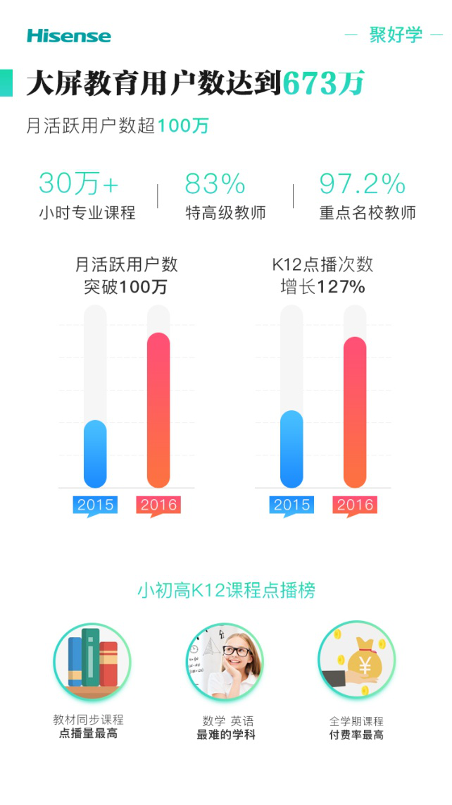 海信發(fā)布《2016互聯(lián)網(wǎng)電視白皮書》,公布其激活用戶量超過2343萬,其中大屏教育產(chǎn)品聚好學(xué)的用戶數(shù)673萬,月活躍用戶超100萬。