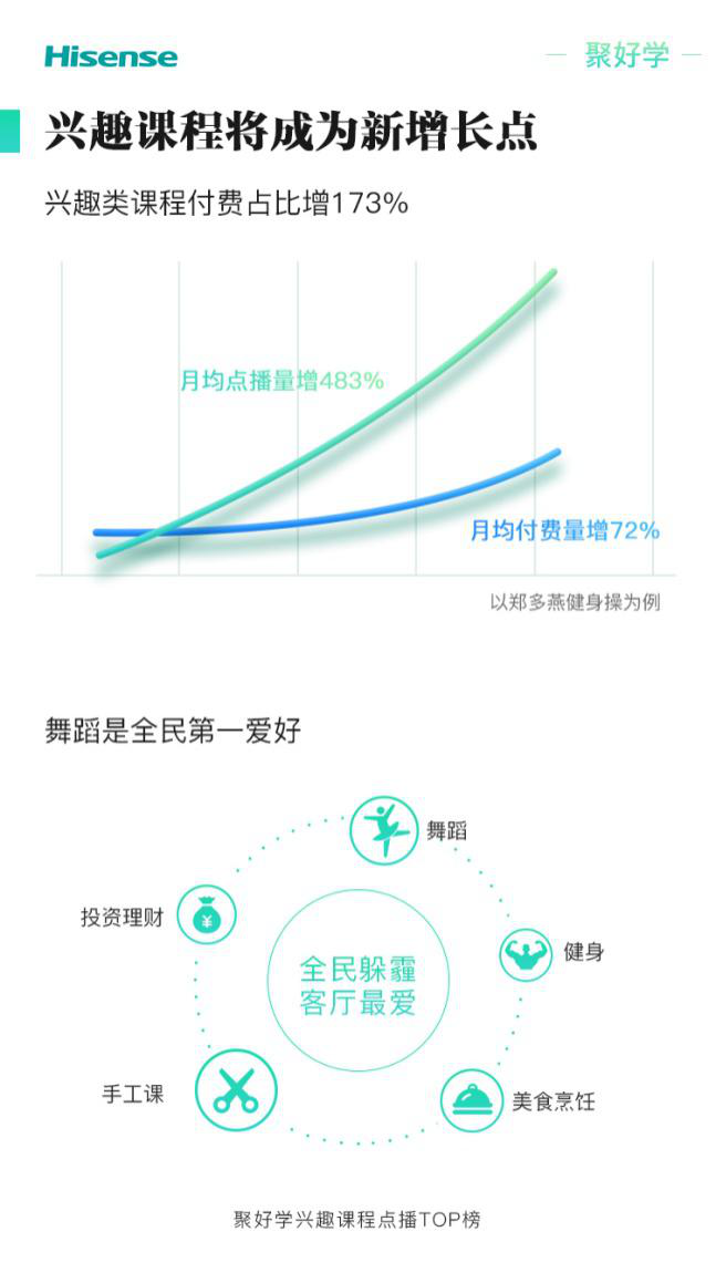 據(jù)海信方面透露,除了K12專業(yè)課程,海信聚好學(xué)的興趣課程全年付費量同比增長173%。其中鄭多燕健身操月均付費增長72%,月均點播量增速達到483%。