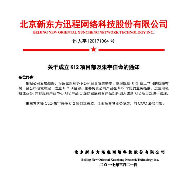 ?多知網(wǎng)3月21日消息,今日,新東方在線發(fā)布通知,將成立K12項目部,由東方優(yōu)播CEO朱宇兼任項目部總監(jiān)。
