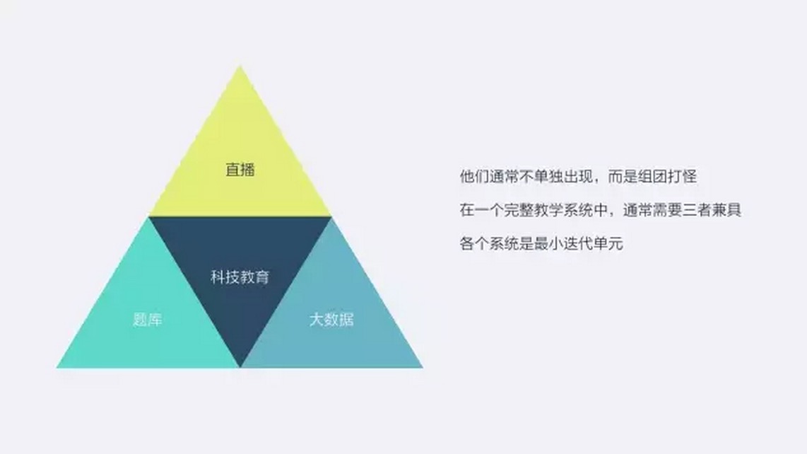我們主要分享教育的數(shù)據(jù)延伸所帶來(lái)的變化,以及我們的具體實(shí)踐。數(shù)據(jù)是最終的結(jié)果,但是光靠數(shù)據(jù)不足以撐起第三代教育機(jī)構(gòu),還有兩個(gè)強(qiáng)有力的助手,一個(gè)是直播,一個(gè)是題庫(kù)。其中,直播是肌肉,題庫(kù)是經(jīng)絡(luò),數(shù)據(jù)是大腦。